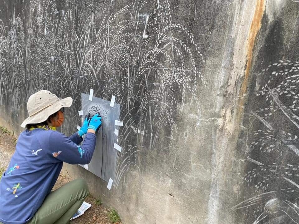 佩如說:我將這個以鋼刷在佈滿塵垢牆上創作的方式,取名為「#垢圖」,「垢」不再只是牆上的汙垢,而是“在自己的「土」地上稱「后」”之意,用這個方式記錄著我和不同場域的相遇,陽光、溫度、氣味、和路上經過的陌生人,構成了我的作品…..