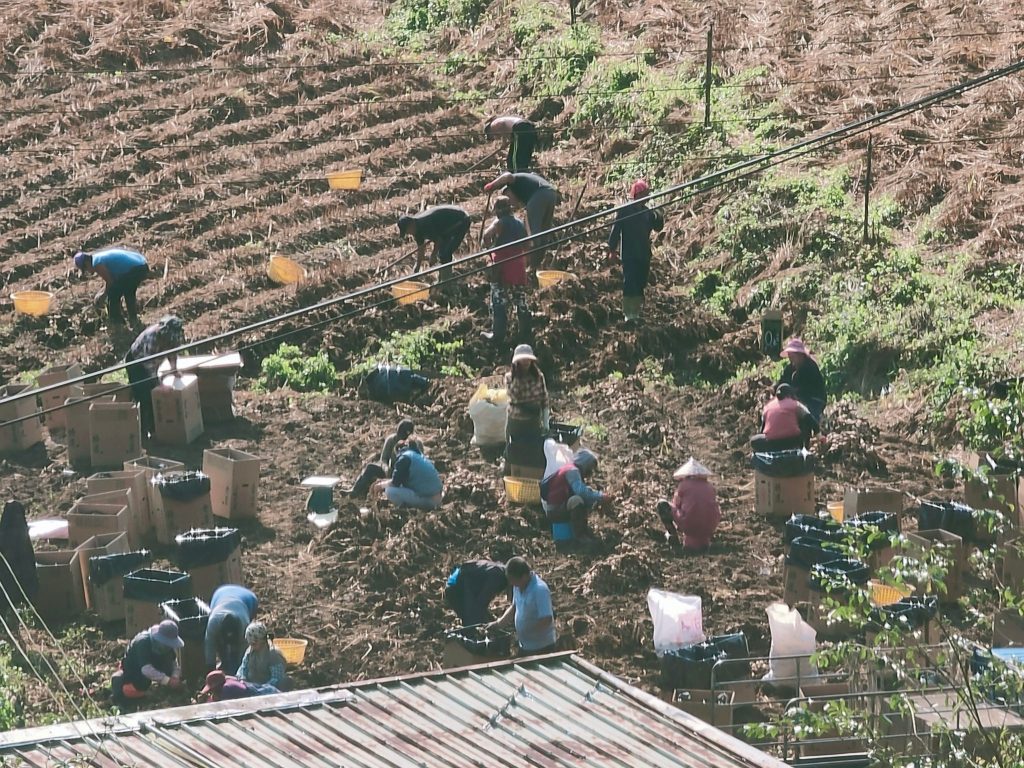 焿寮坪谷地,探訪時剛好農家採收老薑,從遠處看小小的人兒與一箱箱的紙箱,到了近處則是親切的大哥大姊。