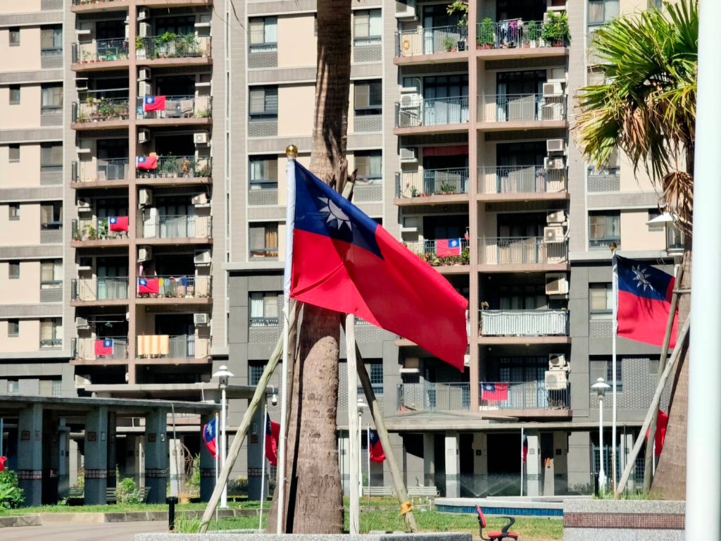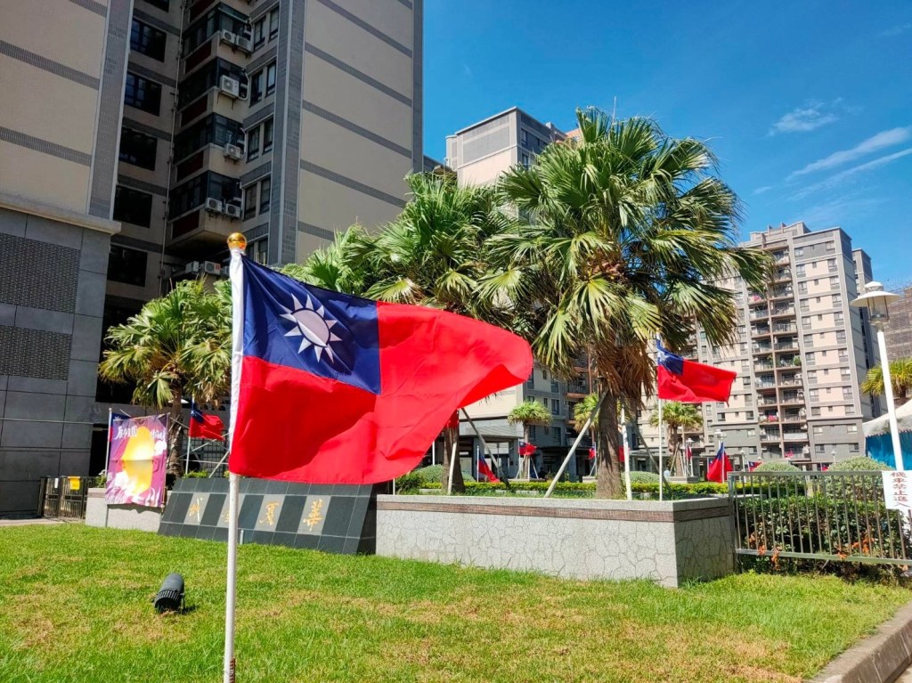 新竹市將軍村旁的華夏金城,許多住戶掛起國旗