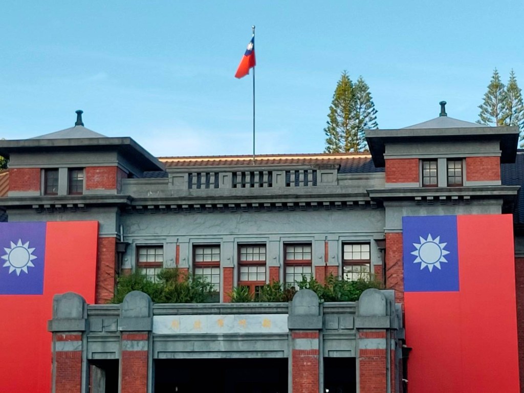 改建後的國宅用國旗繞成護城河