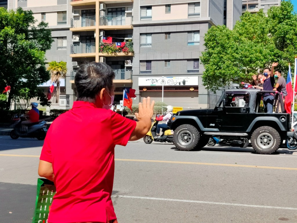 住在華夏金城的大姐看到國旗車隊,很開心的揮手