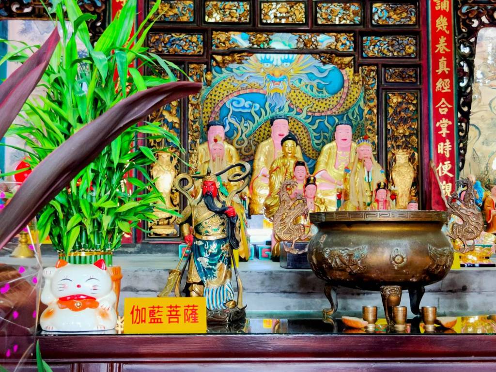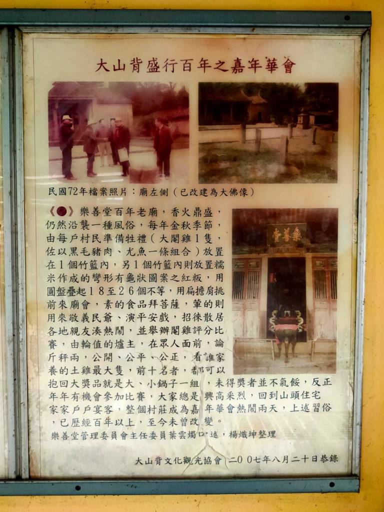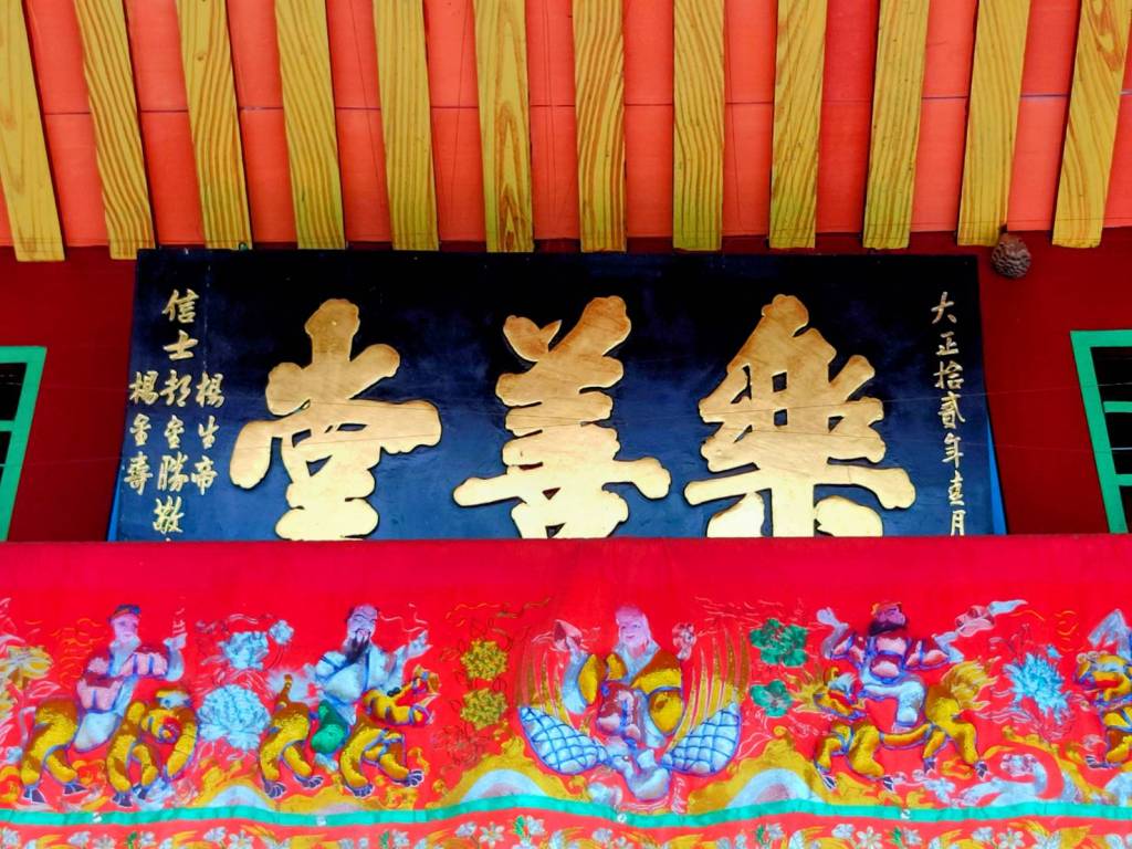 樂善堂恭奉三寶佛、觀世音菩薩為主神,文昌帝君,城隍爺、義民爺,祝生娘娘也供奉其中。廟宇介紹提到,大山背雖然上下學困難,又要放牛,但學子成績卻很不錯,就是文昌帝君相當靈驗。