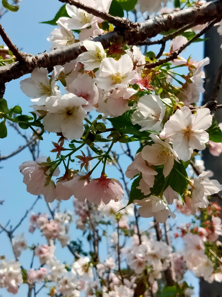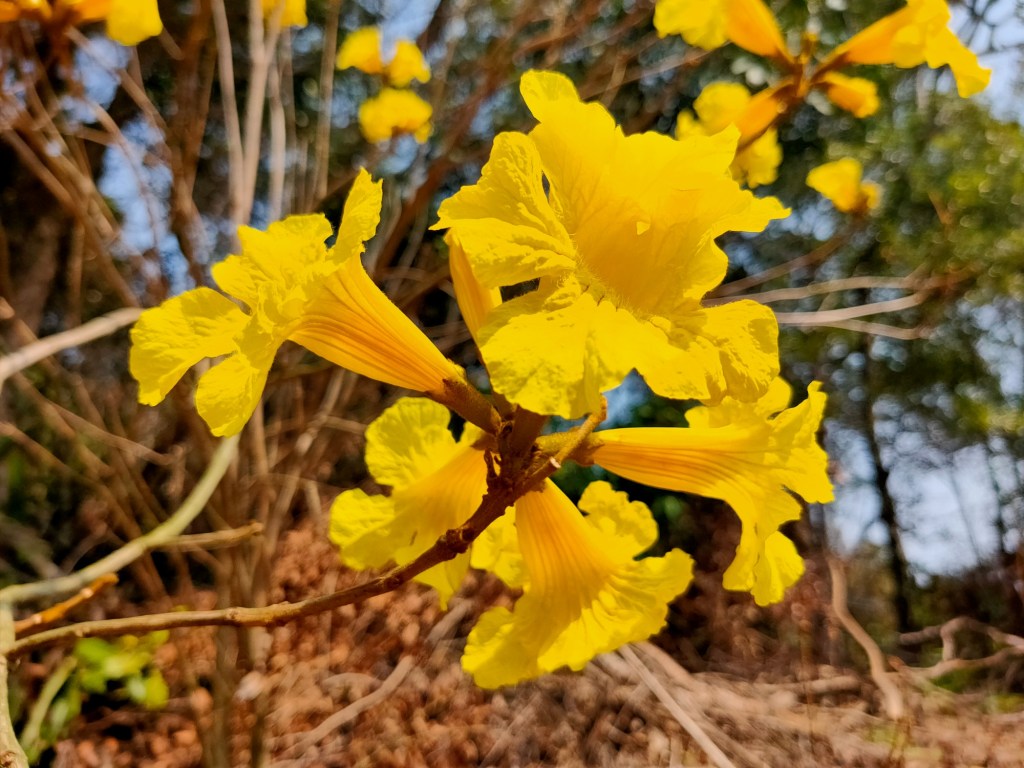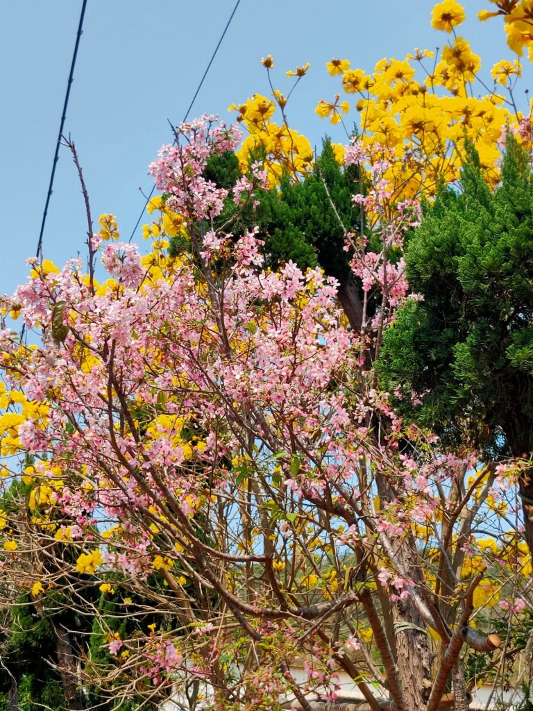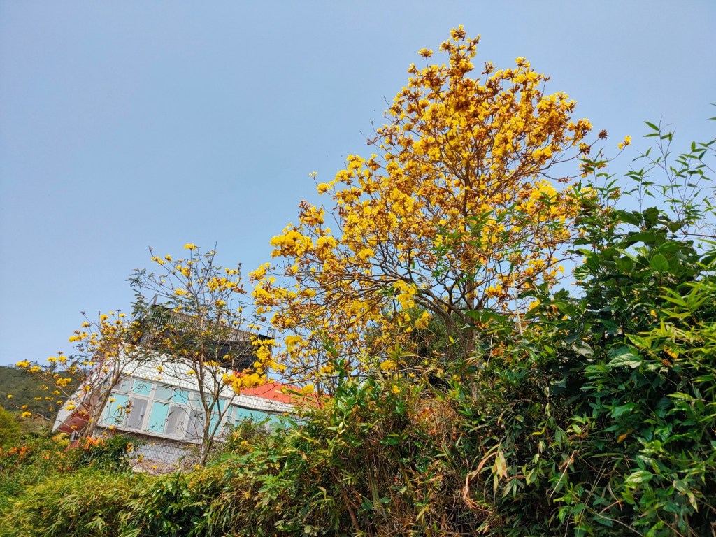在〈新埔詹家黃金風鈴木,花季已經過了最盛開的時候,地上有朵朵的落花。〉中