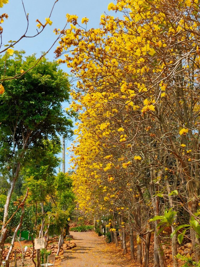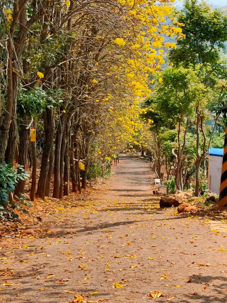 新埔詹家黃金風鈴木,花季已經過了最盛開的時候,地上有朵朵的落花。