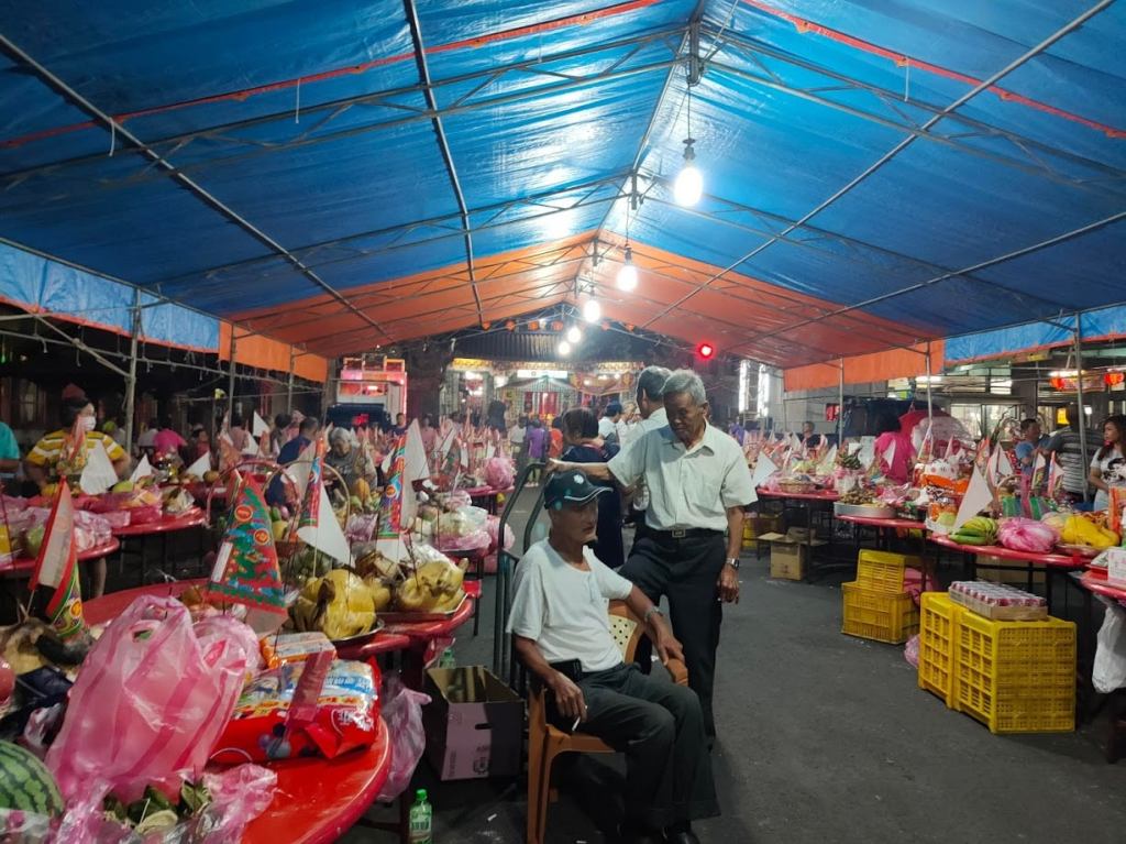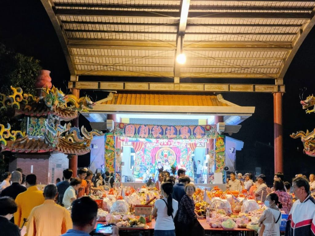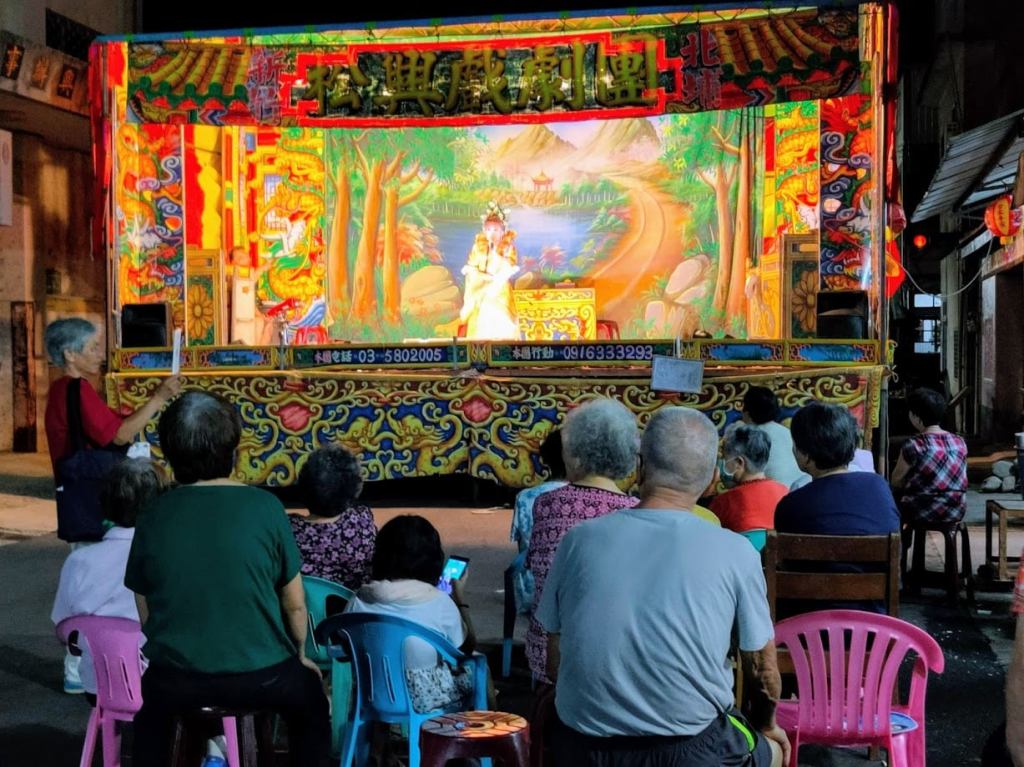 峨眉中盛村:這裡沒有攤位,有著的是村民聚集在國王宮的門前,誠心的跟著道士一起普渡祭拜,幫忙顧前顧後,吃著客家麻糬,而平安戲當然不可少。沒有表演跟攤販,一份濃郁的祭祀氛圍,更顯得慎重虔誠。