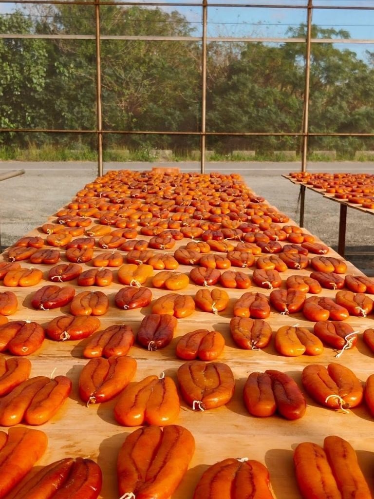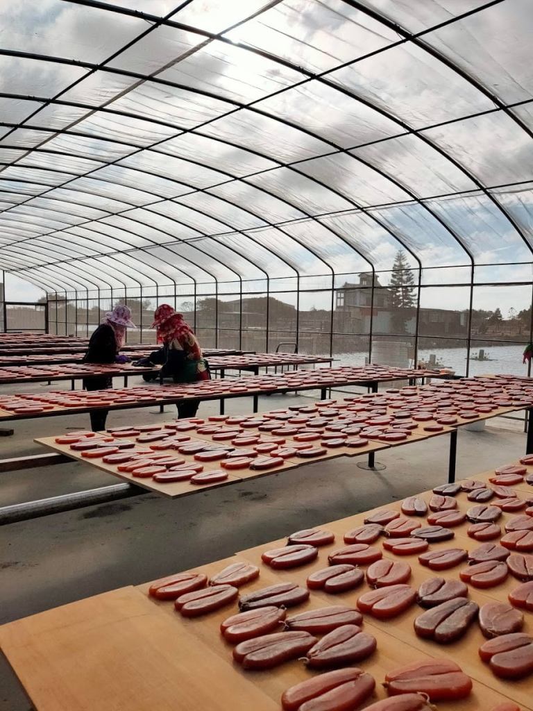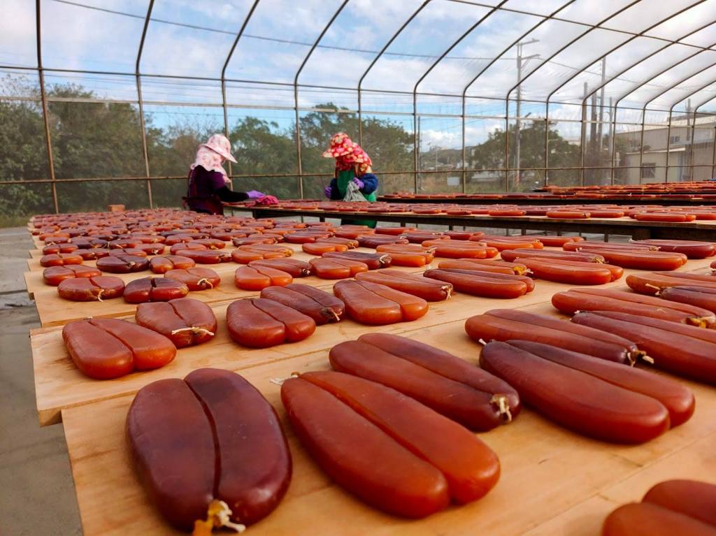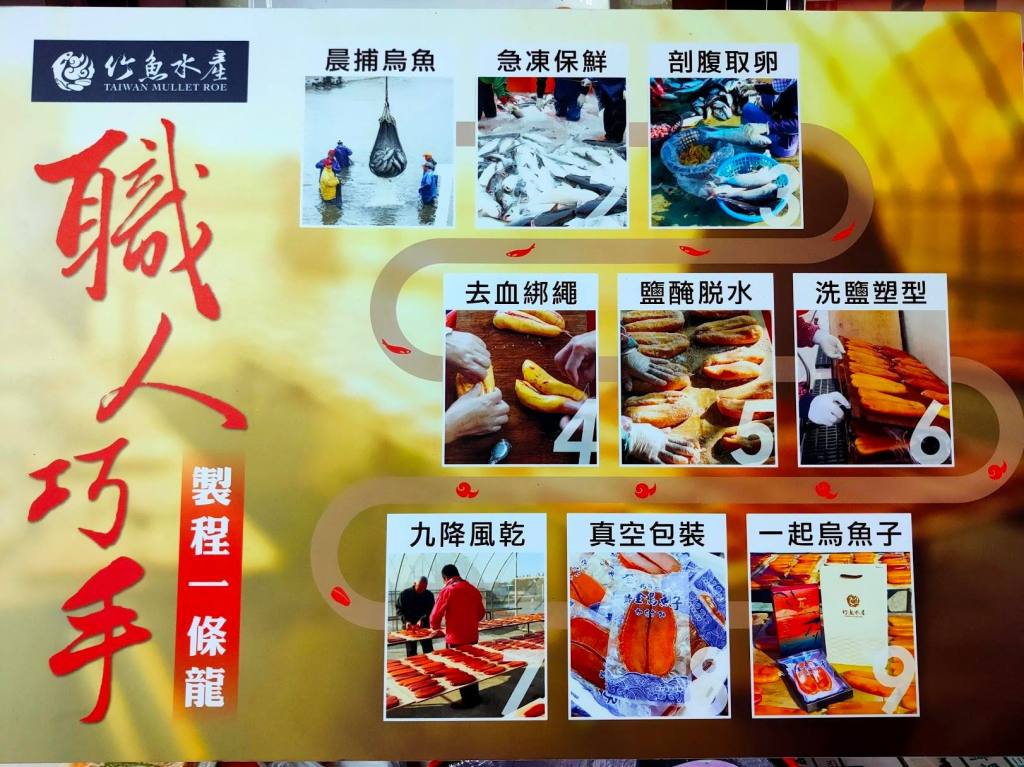 烏金,烏魚子需要長日照,中南部的曬場是主要產區,然而在新竹海邊,因為獨特乾冷九降風的吹拂,所以意外成為台灣最北部的最佳曬場。漁民在11月,烏魚抱卵到最肥美的時候,撈起來取卵,接著經去血綁繩、鹽醃脫水與塑形後,在九降風的吹拂和冬陽下日照下,一塊塊烏魚子在淡淡的鹹香味中逐漸熟成,而網室的曬場也提供了乾淨整齊的環境。 在新竹市的#竹魚水產也多次在全國比賽獲獎,天地人合一的好味道也吸引到米其林大廚慕名前來,堪稱北部烏魚子的第一品牌。