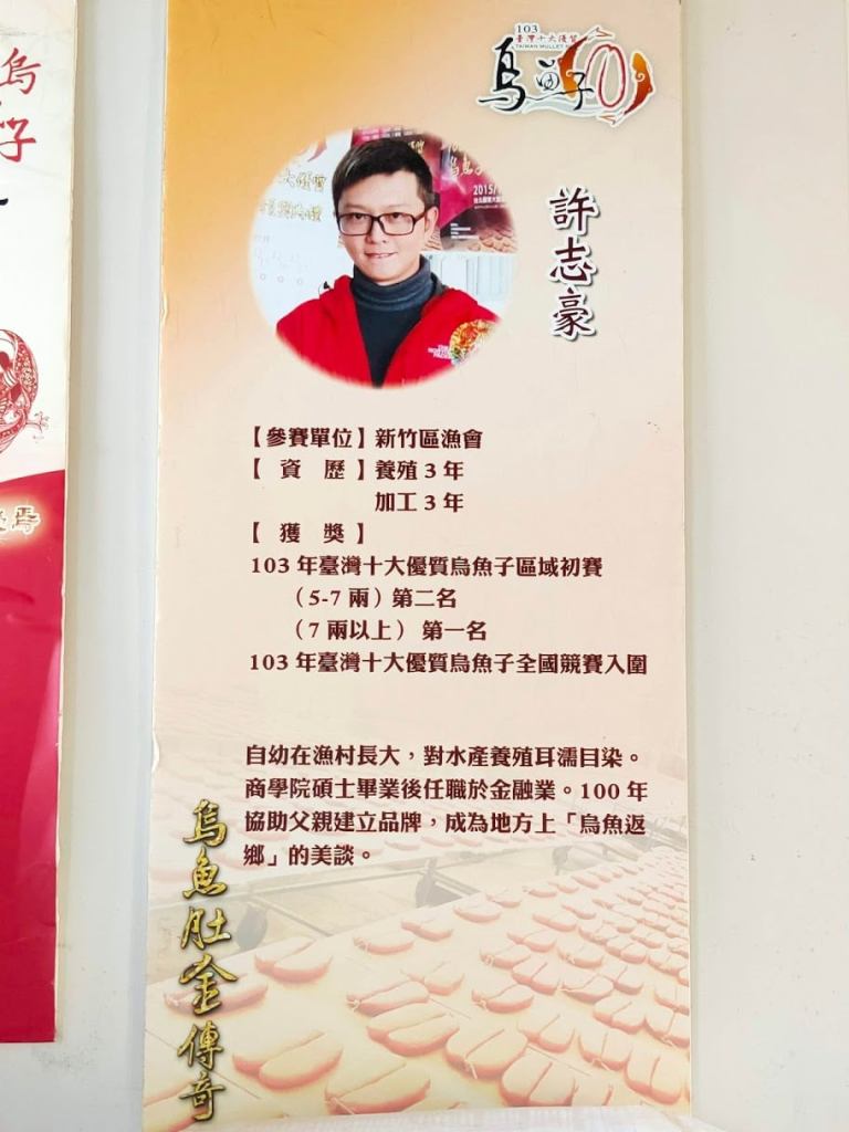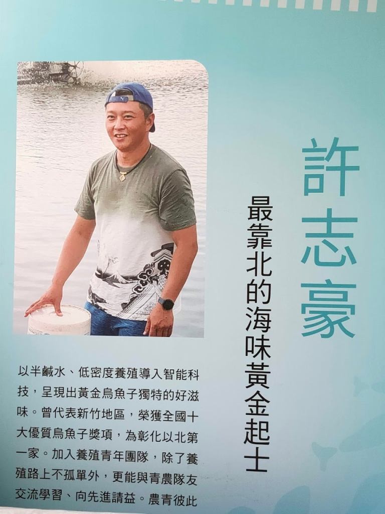 自幼在大庄海邊長大的許志豪,在民國100年返鄉協助父親建立品牌,導入科技化經營與體驗式行銷,成為地方上"烏魚返鄉"的美談。透過臉書的經營,許多民眾會在立冬收成烏魚時,特別前來採買新鮮又營養的新鮮烏魚殼。在業界中少有烏魚子自產自銷一條龍模式的竹魚水產,除了期許扛起"北部第一"的招牌,更希望把九降風吹拂烏魚子的好滋味,吹向全台各地!