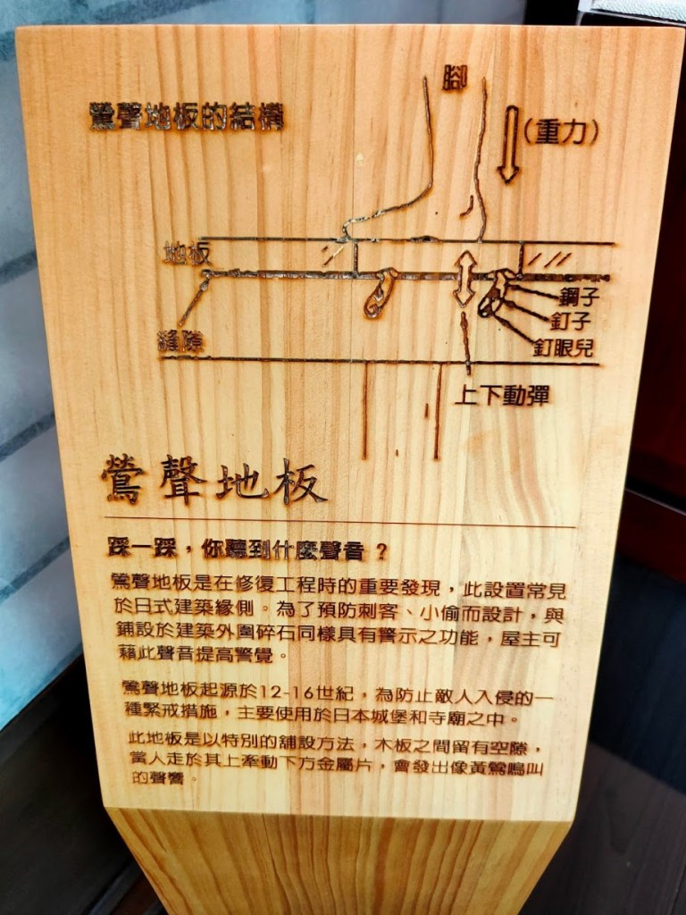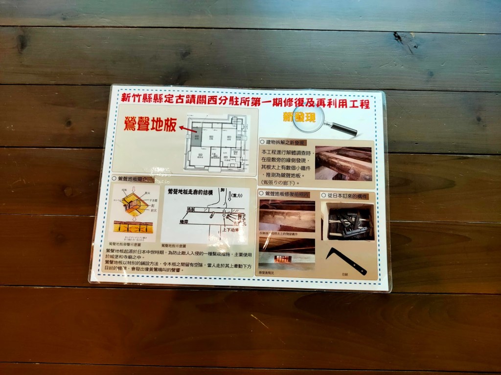 防止小偷的鶯聲地板常用於日本城堡與寺廟,鎮邪的日式鬼瓦、警察巡視的鐵馬等,說明標示都相當清楚。隨著視線穿透在各房間的格局,和窗戶的光影,讓人走進了從前的時光。而關西分駐所前身是太和宮原址、旁邊尚留有以前的磚牆。