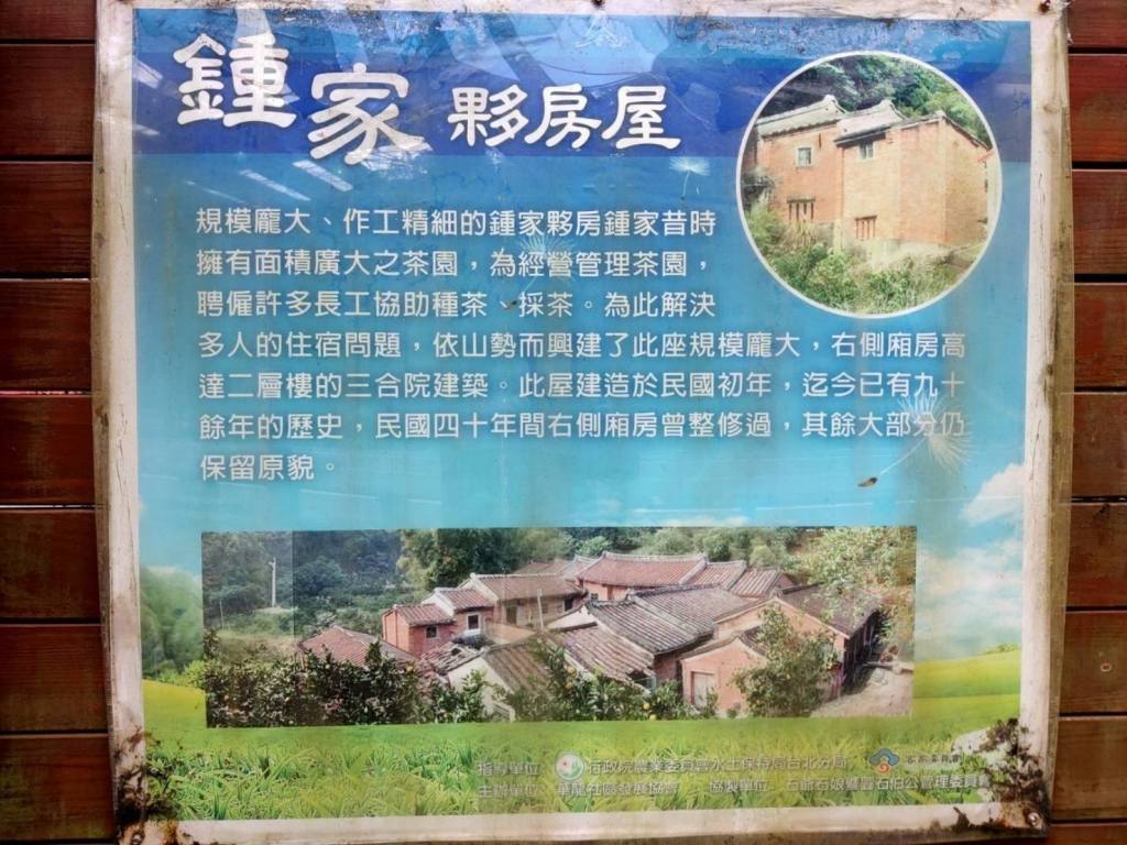 規模龐大、作工精細的鍾家夥房源自於鍾家昔時擁有面積廣大之茶園。為經營管理茶園, 聘僱許多長工協助種茶、採茶。為此解決多人的住宿問題,依山勢而興建了此座規模龐大,右側廂房高達二層樓的三合院建築。此屋建造於民國初年迄今已有九十餘年的歷史,民國四十年間右側廂房曾整修過,其餘大部分仍保留原貌。