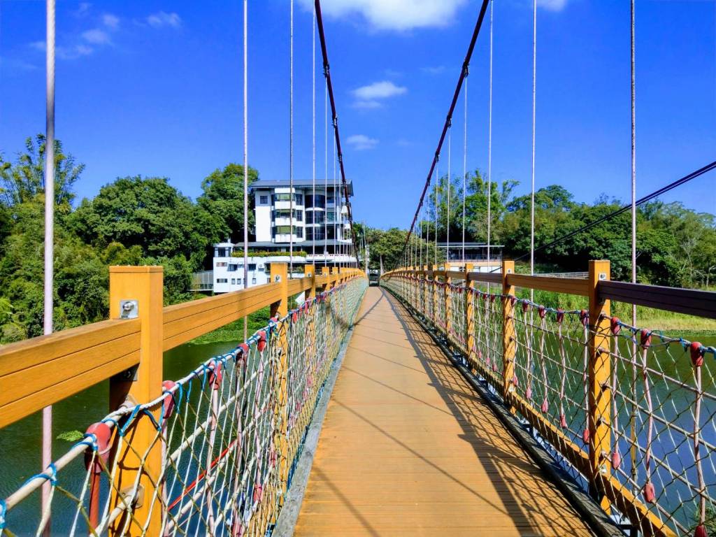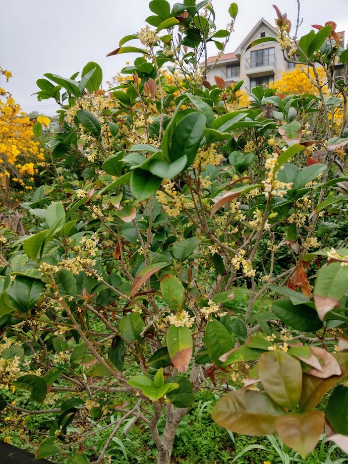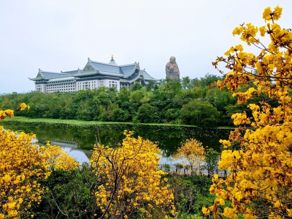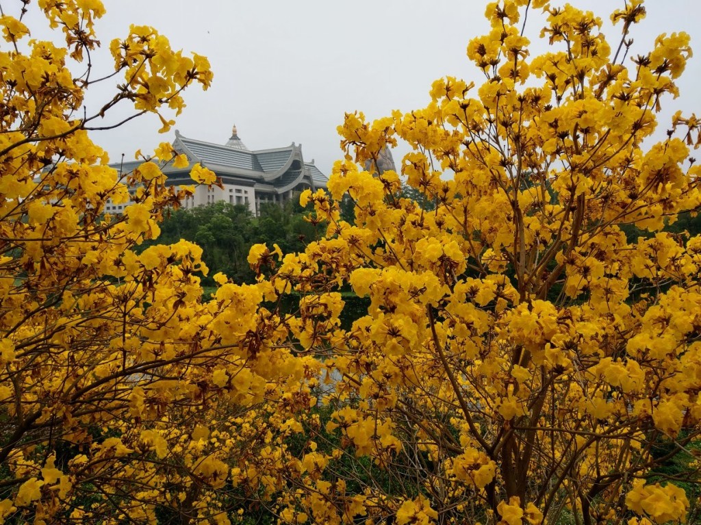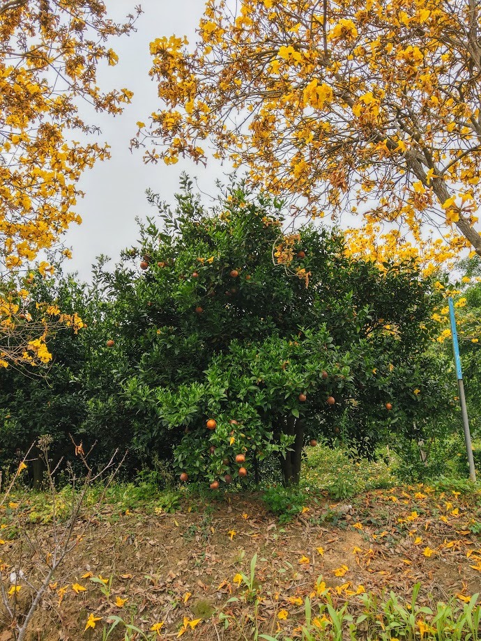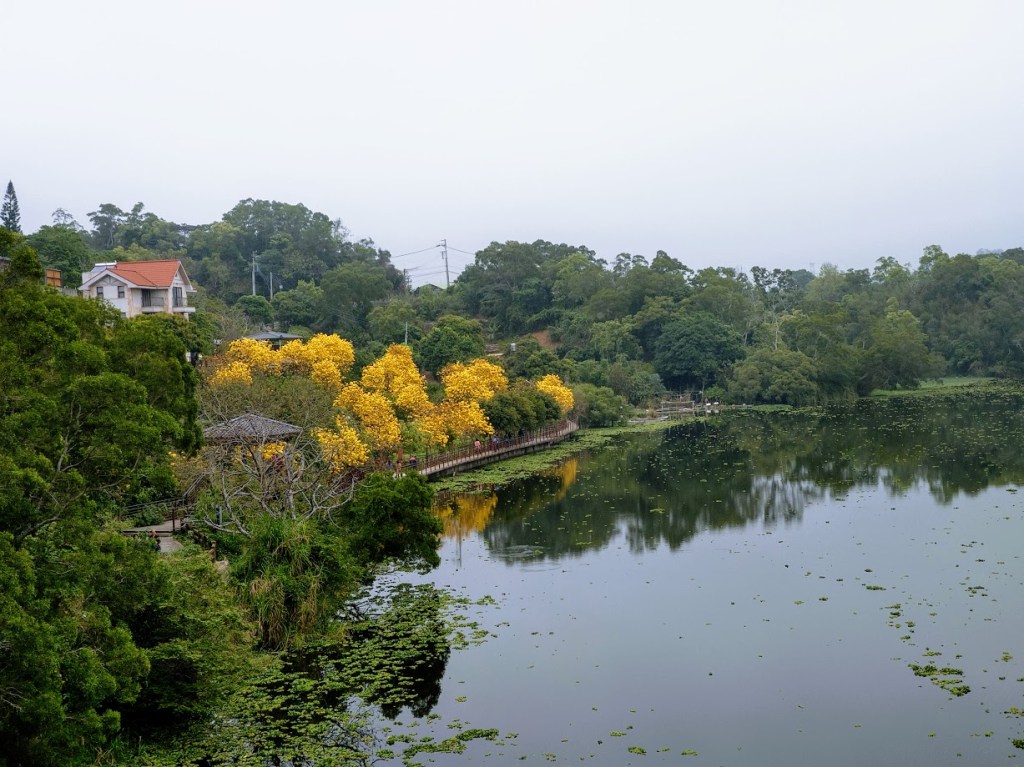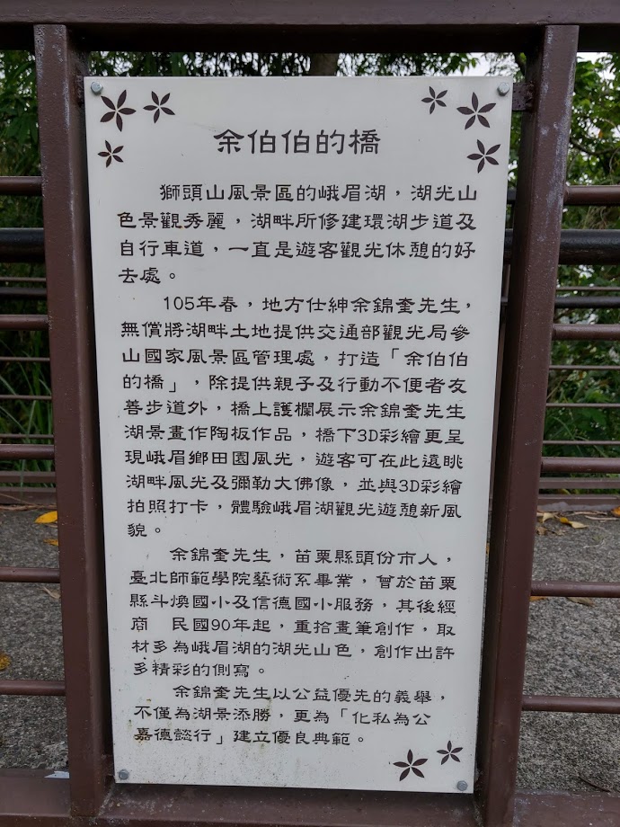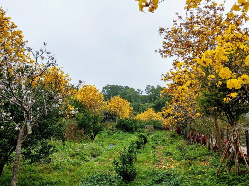 而3月最吸引人的就是 #金湖灣民宿旁邊的黃花風鈴木,在風鈴木旁的環湖步道還有 #濃密的桂花叢,#非常多的桂花以及濃郁的香氣,#此外苦楝、橘子白花也都在環湖步道上喲。環湖步道的一端還有余伯伯的橋,余錦奎先生無償提供土地,讓環湖步道更友善,也加上了3D彩繪描述峨眉風光。