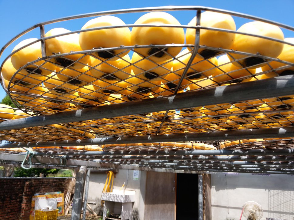 柿子除了使用機器削皮之外,南埔的范老闆自己手削著較熟的紅柿,除了太軟無法用機器削皮之外,也有些被蜜蜂產卵的地方要切除。而 紅柿餅吃起來更香甜,可惜數量不多。