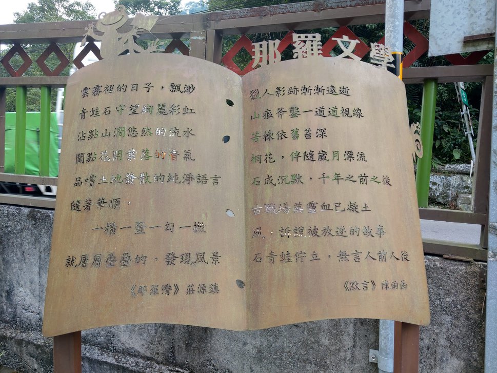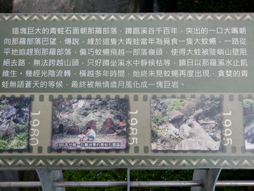 而青蛙石傳說緣於這隻 大青蛙當年為覓食一隻大蚊蠅,一路從平地追趕到那羅部落,偏巧蚊蠅飛越一部落嶺頭,使得大蛙被陡峭山壁阻絕去路,無法跨越山頭,只好蹲坐溪水中靜候枯等,鎮日以那羅溪水正凯維生。幾經光陰流轉,橫越多年時間,始終未見蚊蠅再度出現,貪婪的青蛙無語蒼天的等候,最終被無情歲月風化成一塊巨岩。