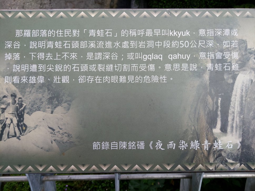 青蛙石風景區位處那羅一部落那羅溪谷,部落的住民對「青蛙石」的稱呼最早叫kkyuk,意指深潭或深谷,說明青蛙石頭部溪流進水處到岩洞中段約50公尺深,如若掉落,下得去上不來,是謂深谷。
