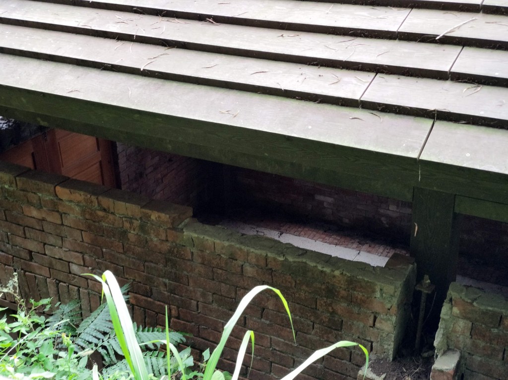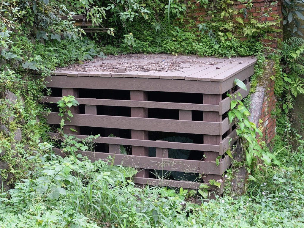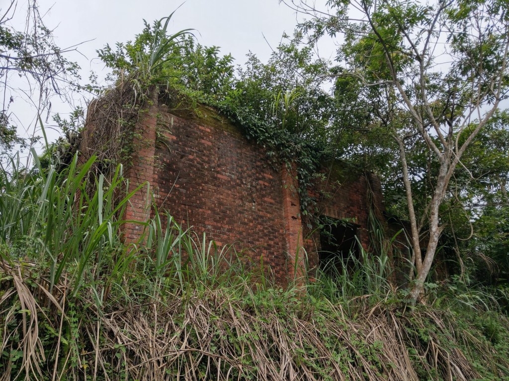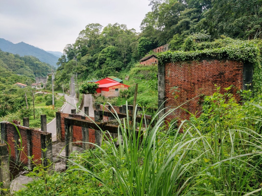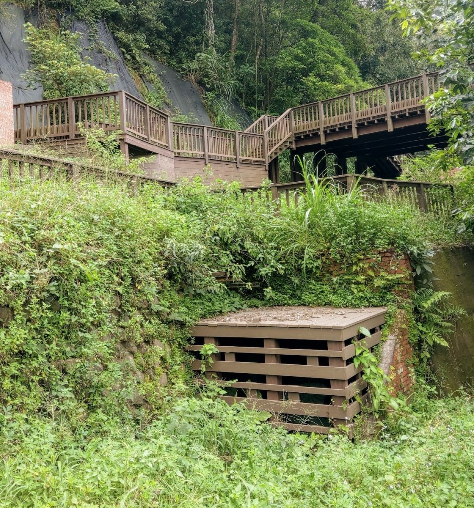 從旁邊的小路彎上去,還可以看到當年纜車基座的遺跡。在前幾年整修過的建豐礦坑近期因為經費不足,又再度被雜草掩蓋,明明在眼前的鐵軌卻被草叢完全掩蓋。阿婆說,三個月不除草就長很高了,而礦坑口已經封起來,因為很深也有危險。