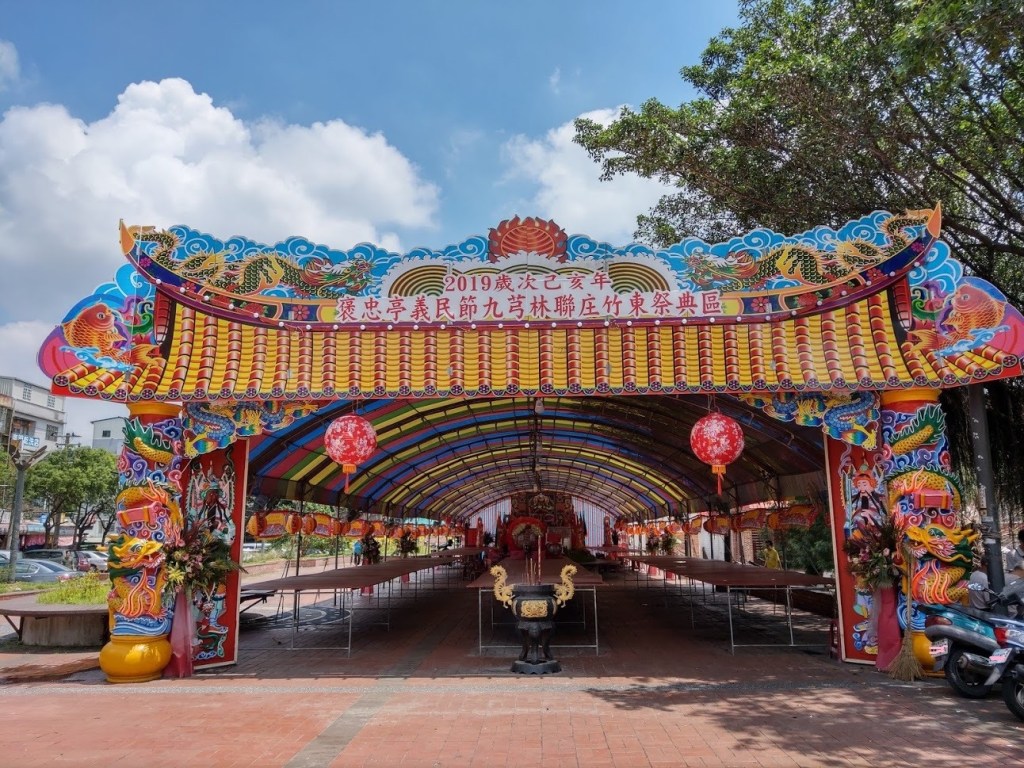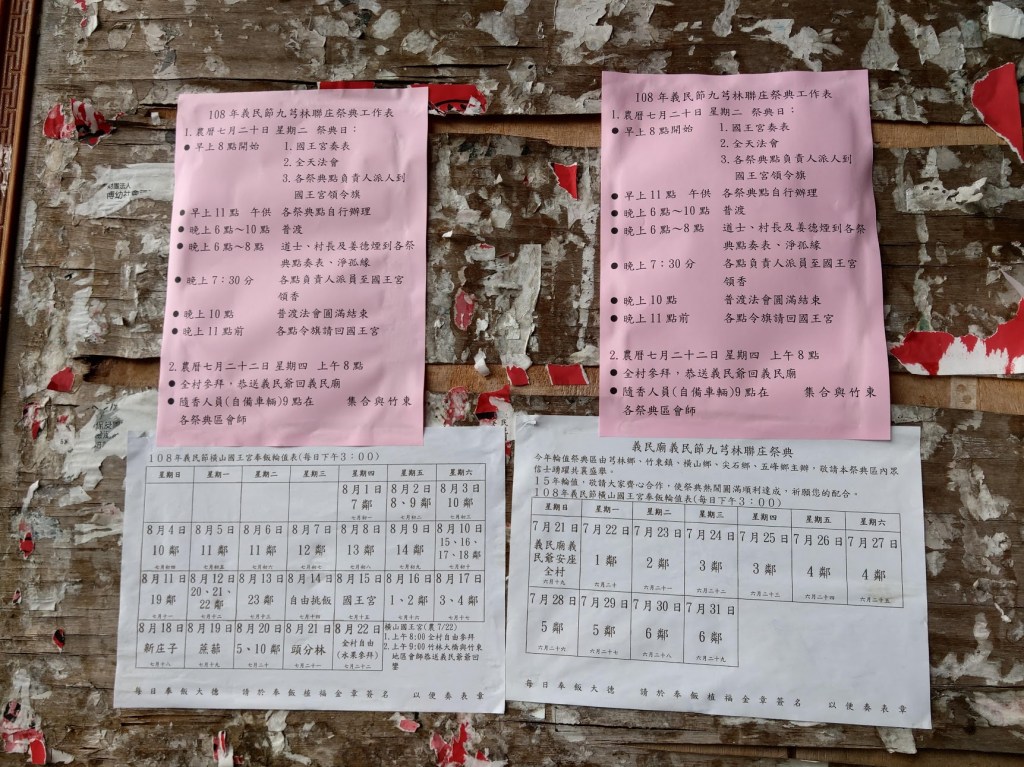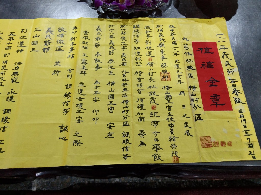 奉飯時,鄉親將飯菜擺好後,將名字登記在 植福金章,記錄下來,等一下跟神明報告。而祭拜唸完植福金章後,需要再用香點一下,表示神明的文書官已經來收走了。因為15年才輪到一次,非常慎重,許多居民出錢出力,也說下一次義民祭時,自己可能沒力氣做了,祭拜的過程也有專門記錄,未來可以給後代子孫傳承。奉飯的過程也有些許年輕人跟小孩參與。而竹東的祭典區放在戲曲公園。 在橫山遇到許多大哥大姐都很熱情,跟拿水招呼,聊天關心,讓人感受到暖暖的人情味。而大姐也述說著這些年來義民爺的保祐,讓子孫考試當兵就業一切順利。