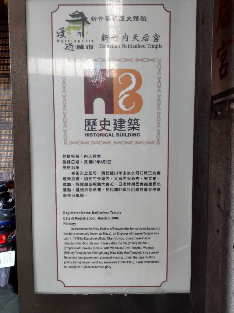 內媽祖廟由淡水同知陳玉友創建於乾隆十三年(1748年),當時與文廟、武廟、城隍廟並稱四大官祀,原址在竹塹城舊大字西門後街的範圍內(今新竹市西門市場附近)。日治時期因皇民化運動遭拆除,於民國35年(1946年)利用竹壽寺改建為今貌,現為歷史建築。