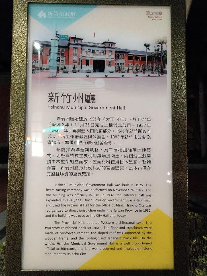 竹塹從福建 王世傑屯墾算起 開城三百年,新竹州廳是國定古蹟,興建於臺灣 日治時期,西元 1925年(大正14年),於1927年(昭和2年)11月26日完成上棟儀式啟用1945年新竹市政府成立,沿用州廳做為辦公廳舍。日治時新竹州的範圍尚包含苗栗與桃園。
