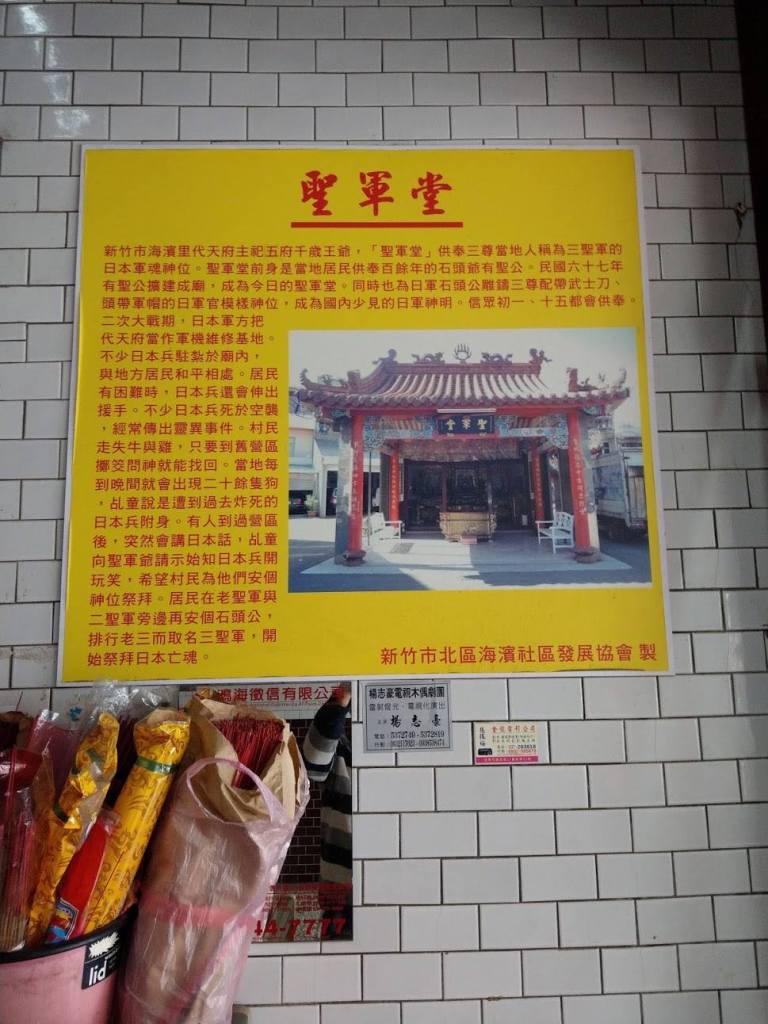 聖軍堂,二次大戰期,日本軍方把代天府當作軍機維修基地。不少 日本兵駐紮於廟內,與地方居民和平相處。居民有困難時,日本兵還會伸出援手。不少日本兵死於空襲,經常傳出靈異事件。村民走失牛與雞,只要到舊營區擲筊問神就能找回。當地每到晚間就會出現二十餘隻狗,乩童說是遭到過去炸死的日本兵附身。有人到過營區後,突然會講日本話,乩童向聖軍爺請示始知日本兵開玩笑,希望村民為他們安個神位祭拜。居民在老聖軍與二聖軍旁邊再安個石頭公,排行老三而取名三聖軍,開始祭拜日本亡魂。