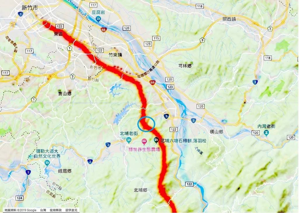 分水龍,分水嶺的意思;在竹東和北埔交界附近最高的山頂上,那片丘陵是 中港溪 和 頭前溪的分水嶺,是北台灣的龍脈之一,從 五指山一直到新竹市。相傳日本人當時開路,發現昨天開的路,早上去了又恢復,沒辦法開,就詢問地理師,發現有龍脈在,需要灑黑狗血才能夠開路,於是就在當地灑 黑狗血,破龍脈,路就開好了。龍脈延著公車站牌旁邊的山稜線走,橫跨現在的台三線。