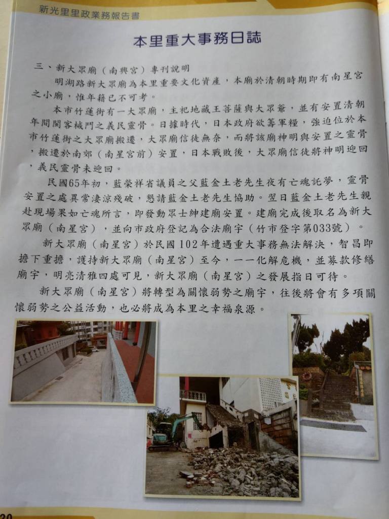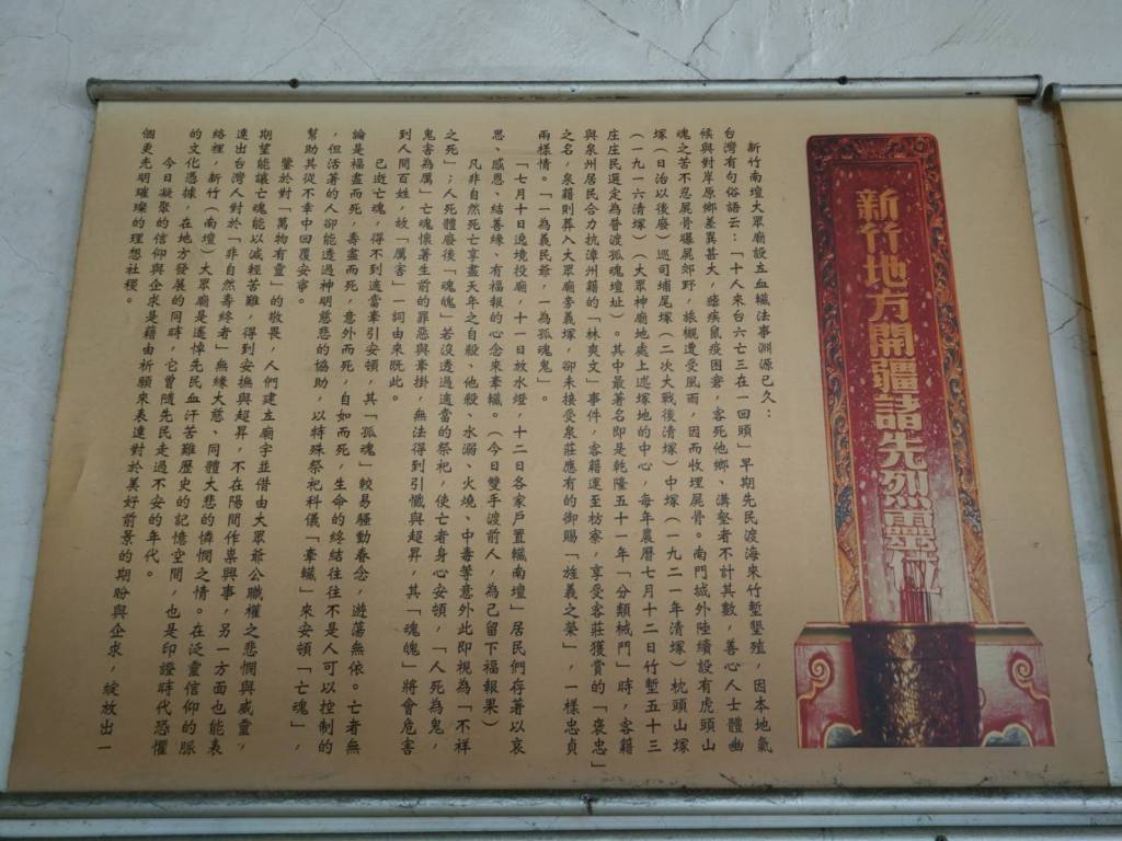 清乾隆與同治時台灣分別出現林爽文與戴潮春事件,清朝政府請在台民眾協助,義民廟的大小塚就是紀念當時的客家義軍。#而新竹城內,則是以泉州人為主的民兵團,#在戴潮春時則由林占梅率領,前往平亂。後來這些犧牲的泉州義士,#安放在南壇大眾廟(竹蓮寺旁)。但其實在日據時代,#因為皇民化政策以及日本人想要那塊土地,#於是神明與義士的骨灰遷到明湖路南星宮,又名新大眾廟。在光復後,神明迎回南壇大眾廟,#但後來義士的骨灰持續放在南星宮-新大眾廟。