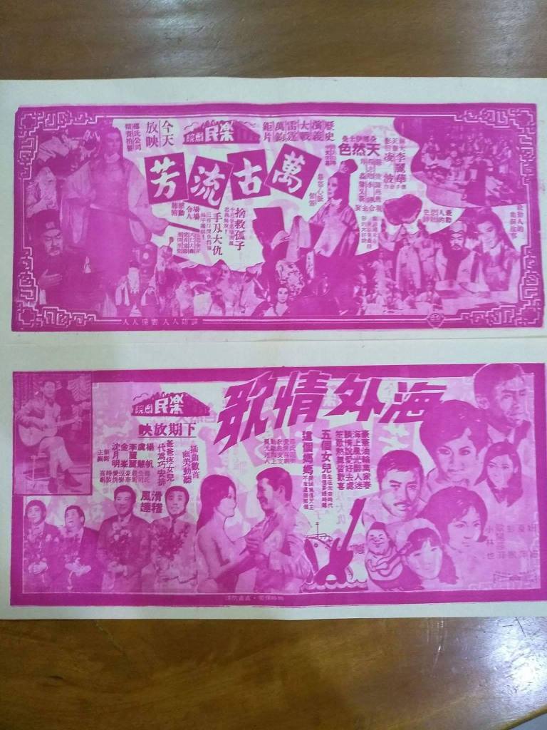 新竹市約50年前樂民、新世界及國際戲院的彩色傳單