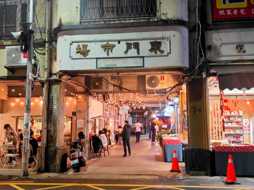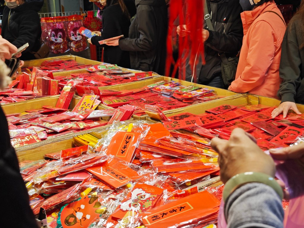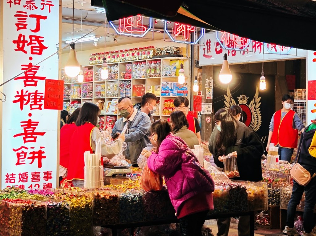 和城隍廟相連,沿路的騎樓有手寫春聯讓年節的氣氛更濃郁。或許是周六,開幕的人潮較往年多,大多數的攤位生意都相當好。