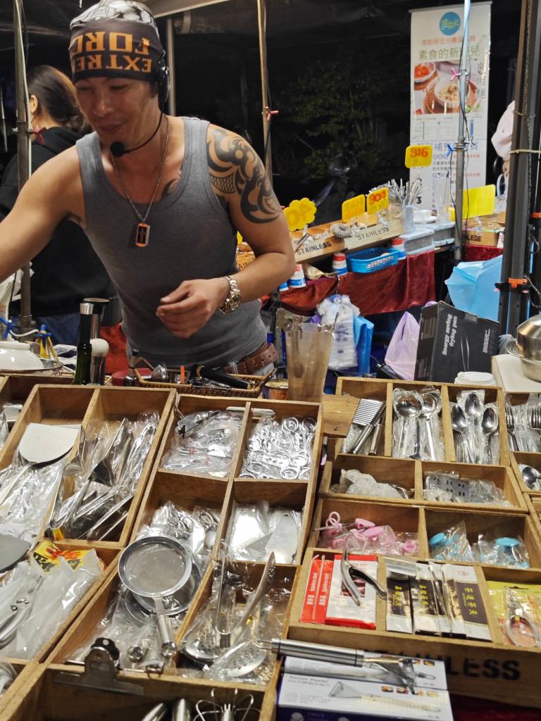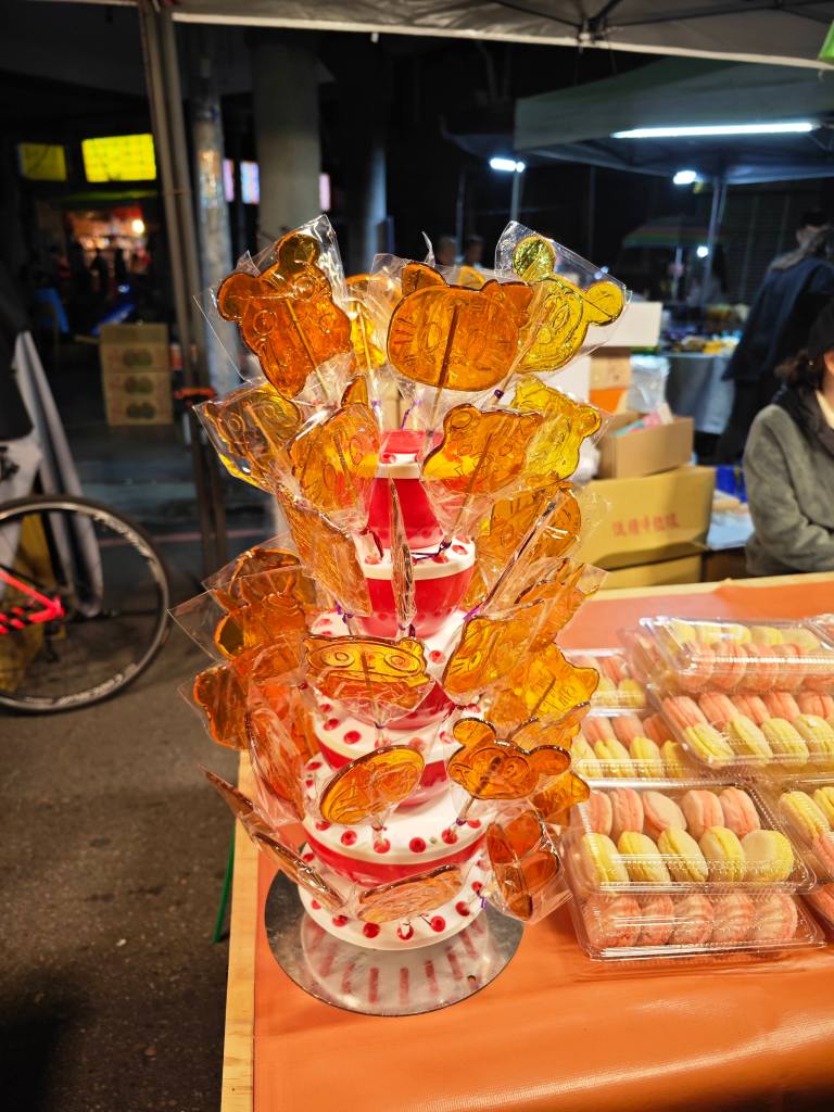 許多常見的攤位、#炒麵、#米粉、#香腸、串燒、臭豆腐、#糖葫蘆、#鹹酥雞,#炸烤魷、還有香水攤、紅包。在中央市場入口還有賣糕餅點心的店家、從早上直播到晚上、曝光度相當高。