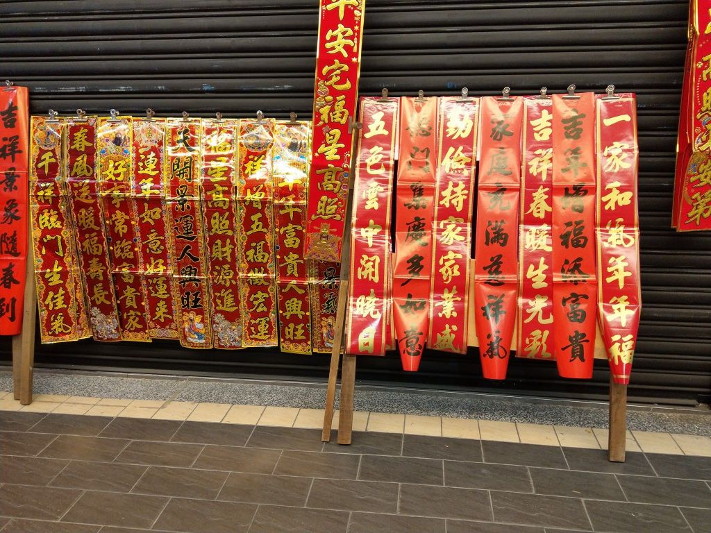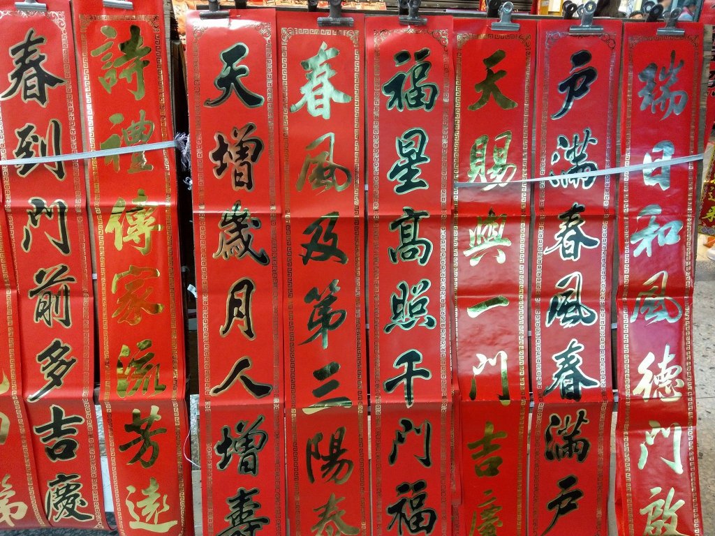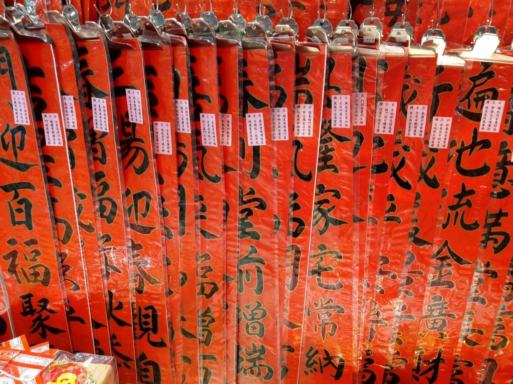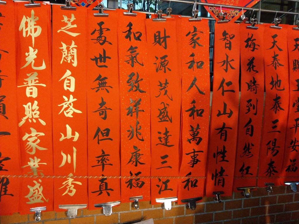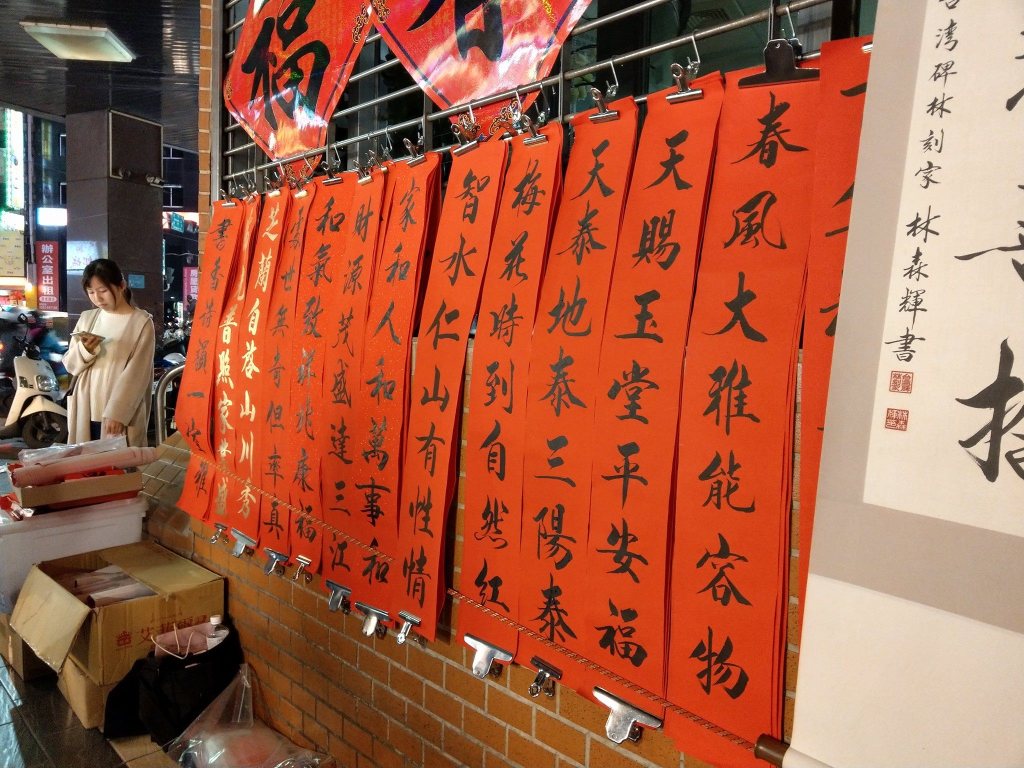 春聯是過年中最具代表性的習俗,象徵除舊布新(原為避邪驅鬼)。一家家的春聯看過去,還是手寫春聯最吸引人,老闆說,竹南竹北客家人特別喜歡手寫後,外面在描上金漆的款式。不然會賣不出去。