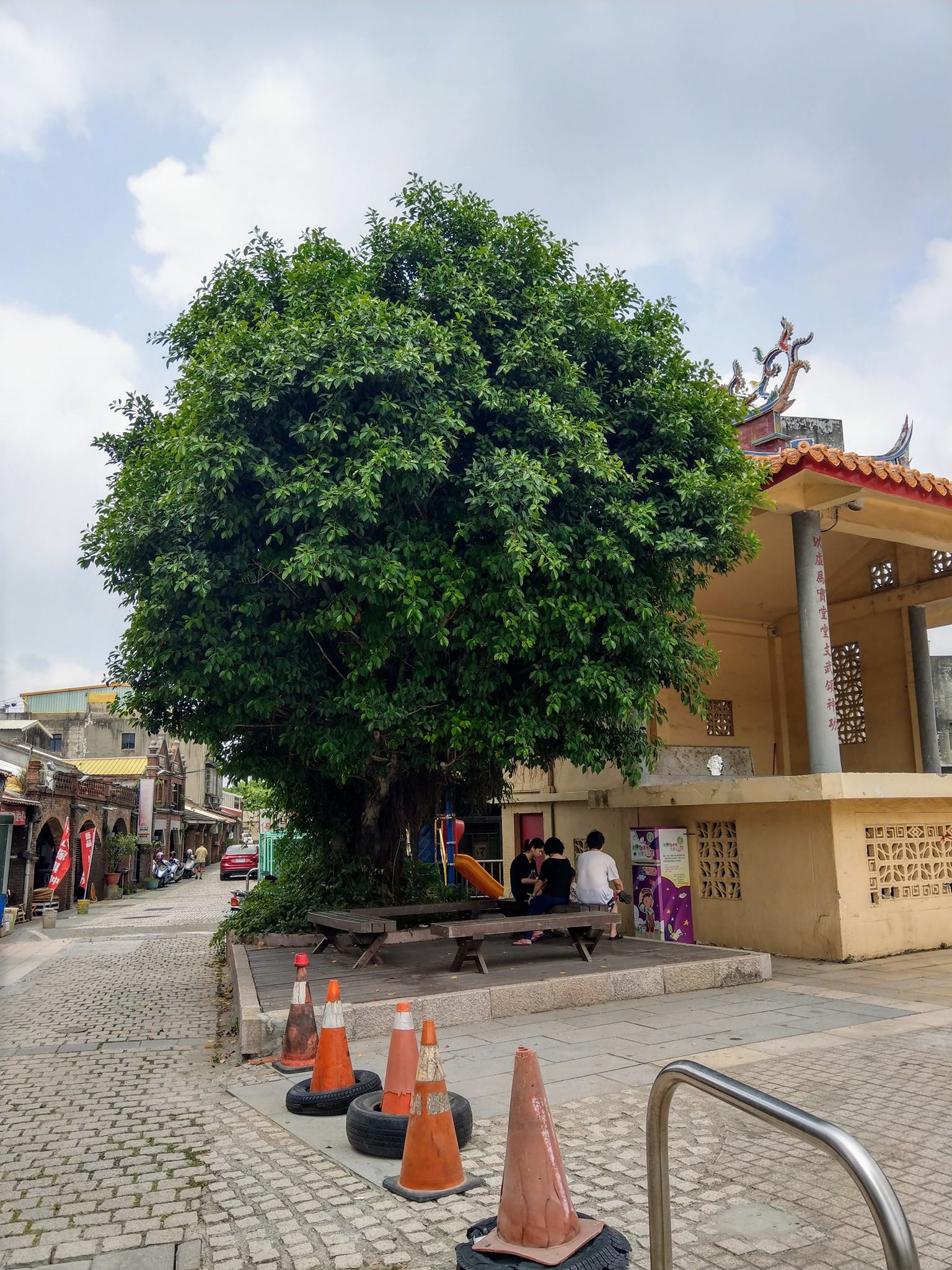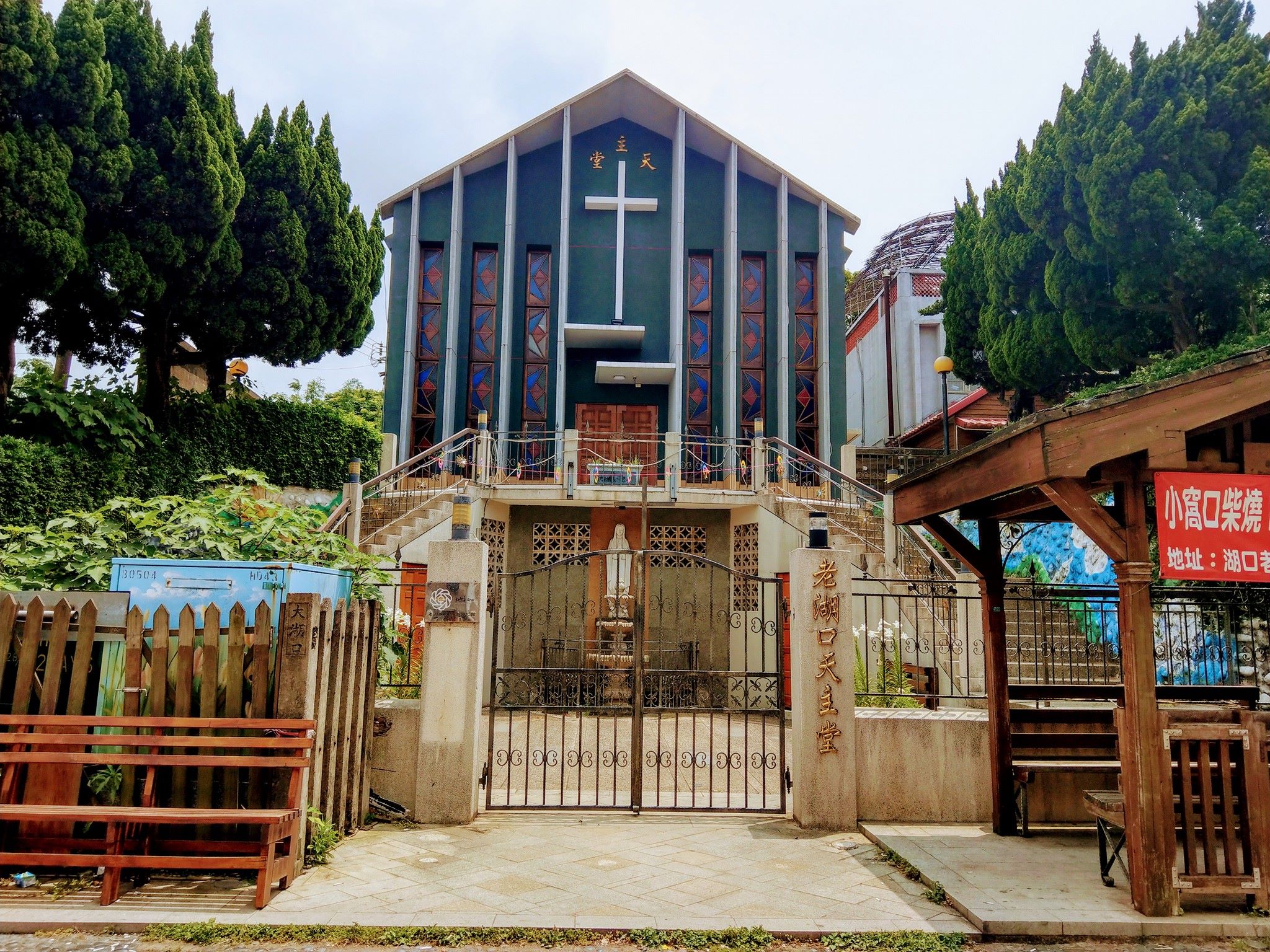 老街一端的三元宮,始於明治三十七年(1904年)左右開始募款籌措,於大正七年(1918年)從新改建,代表著客家文化與客家聚落的重心。當然神明的護佑是不分閩客的,5/1勞動節那天,一對標準閩南口音的夫婦虔誠地祈求神明的保佑。另一端的緣起於1952年神父開始在湖口地區傳教,而天主堂於1966年完工,在民國50年代,物資尚缺乏的時候,也對居民有不少幫助。
