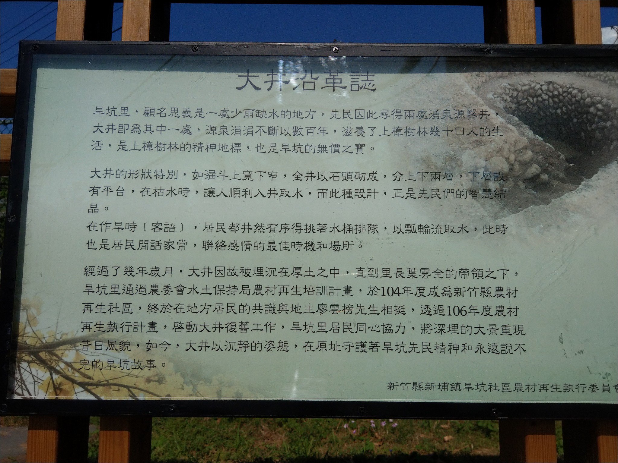 旱坑里地勢高,早年取水不易(看名字就知道),這口280年歷史的大井,扮演里民用水極重要角色,如今在屋主大方提供土地下,轉型成公園一處亮點,期盼遊客到旱坑里除認識柿餅產業,也能走進上樟路文化路線,體驗獨特挑水文化。